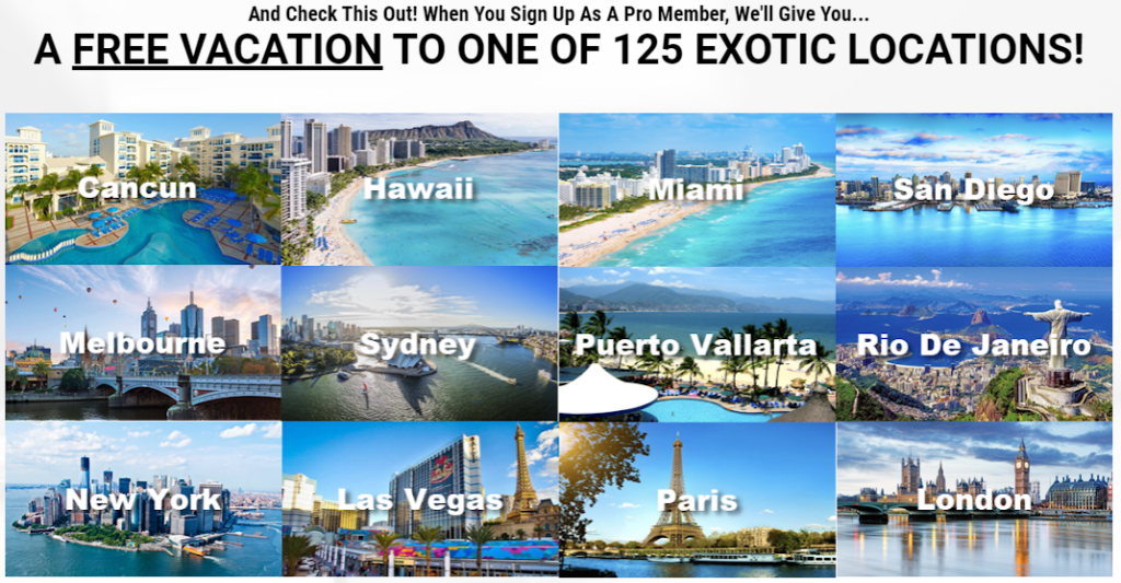And check this out, when you signed up as pro member, they are also going to give you a free vacation to one of 125 exotic locations, and this is just a sample of them.